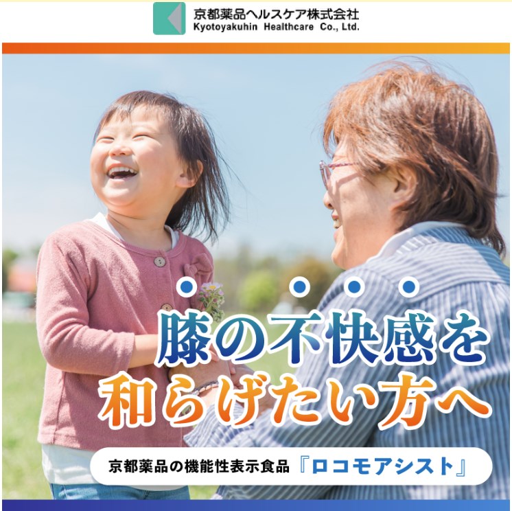 ロコモアシストは京都薬品ヘルスケア株式会社が製造・販売する機能性表示食品です。膝関節の曲げ伸ばしをサポートし、膝の不快感をやわらげる効果が報告されています。
